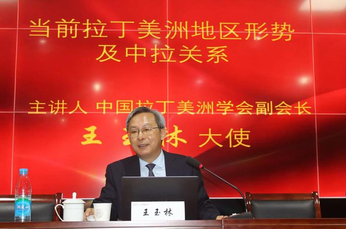赠书仪式结束后,王大使以“当前拉丁美洲地区形势及中拉关系”为题进行讲座。他从拉美地区概况、当前形势主要特点、中拉国家及政党关系三个维度展开,重点结合古巴、巴西、墨西哥、阿根廷等案例,深入分析了中拉合作的机遇与挑战,并就中拉关系发展提出专业建议。讲座最后,王玉林大使寄语西语系师生:“拉丁美洲是极具发展潜力的地区,相关领域工作不仅是职业选择,更是一项值得投身的事业。期待同学们积极投身其中,施展才华,实现人生价值。”此次活动不仅为我校西语系师生提供了优质学术资源,更激发了师生深化拉美研究、服务国家战略的学术热情。