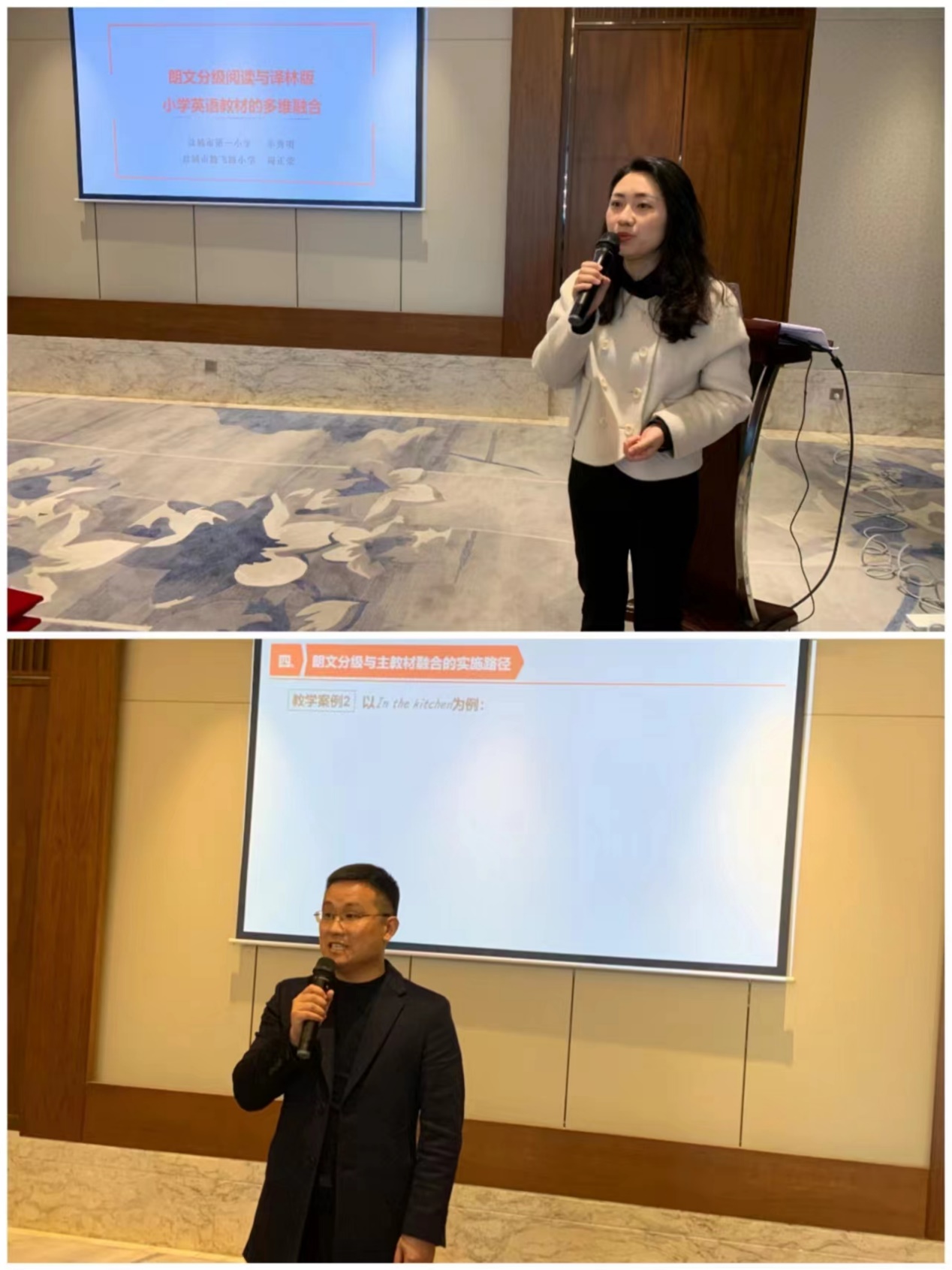 授聘仪式后,盐城市教科院葛连干名师团队的周正荣和羊秀明老师做了关于《分级阅读与译林版小学英语教材的多维度融合》的专题讲座,与参会教师分享了教科书与课外分级阅读融合教学的教学心得。