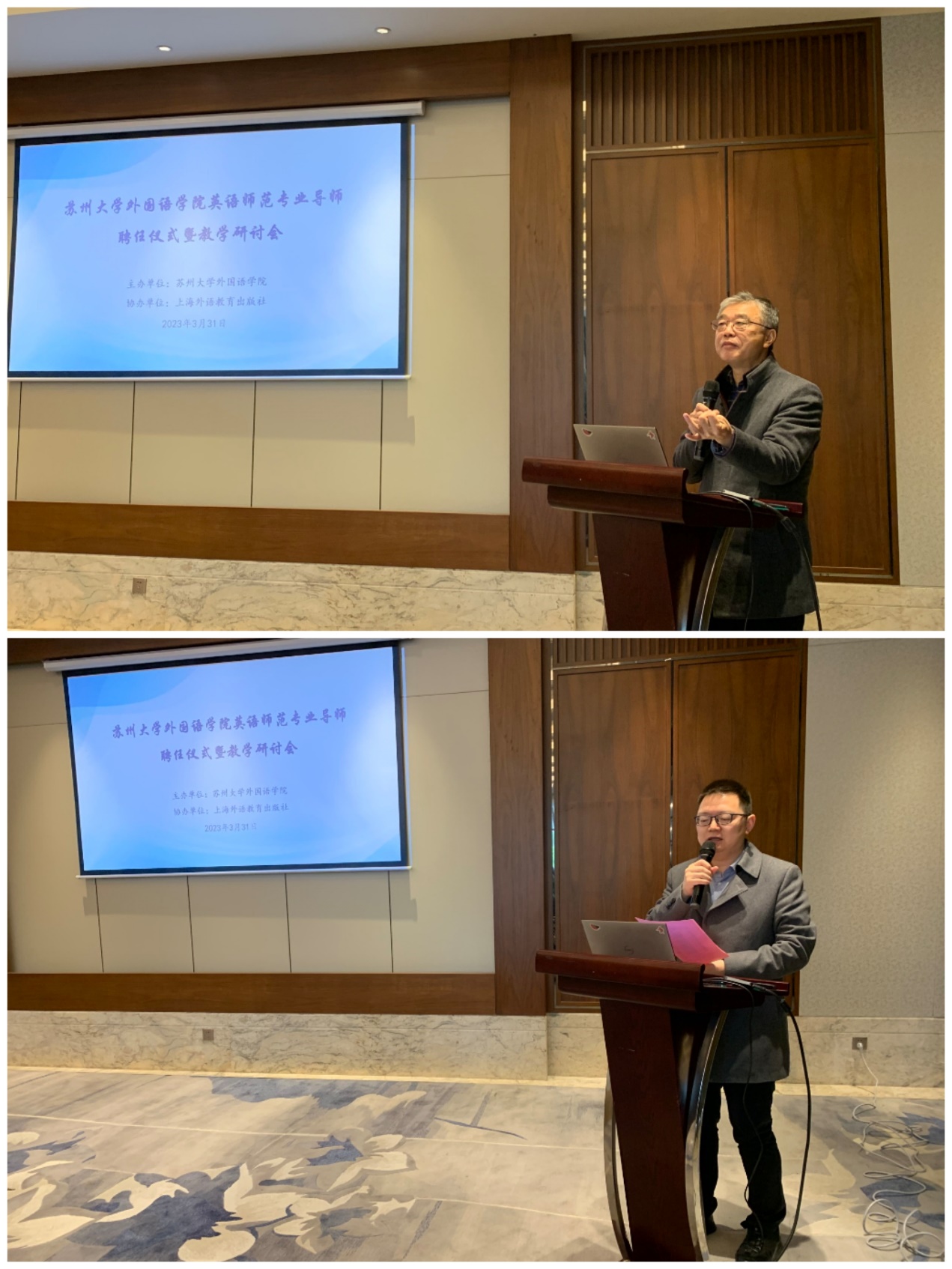 接着,举行了授聘仪式,苏州市教育科学研究院袁峥教研员和南通市教育科学研究院沈国锋教研员分别代表受聘教师做了精彩的发言。袁峥老师就教研需要开阔眼界、不能闭门造车;师范生的教育与探索;外教社优秀读本与新国标教学的融合和导师渡人、渡己发表了自己的独到见解。沈国锋老师就提供教学参与平台、提升教学教育理念、发展教研课题能力等做了深入的阐述。