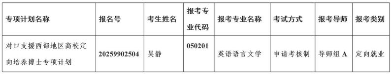 根据有关文件及通知精神,结合2025年博士研究生专项计划报考考生的申请材料,本单位进行了资格审核与材料评价。现将2025年博士研究生专项计划招生进入综合考核人员名单予以公示,综合考核具体安排等另行通知。