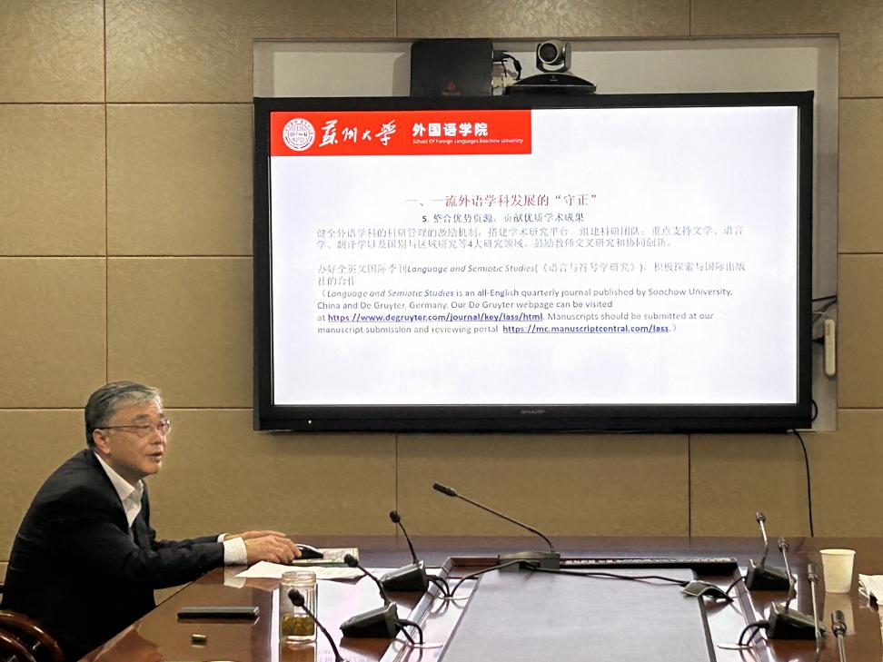 随后,朱新福院长介绍了学院的发展现状,朱院长指出,要“提高外国语言文学学科的综合竞争力,培育和发展新文科和交叉学科”,并注重教师发展,加大师资队伍建设,以及高层次人才培养和引进的支持力度,形成良好的学科梯队。同时,通过打造翻译学科高原、建立专业实践基地,以及提升服务社会水平等举措,提升外语学科发展水平。