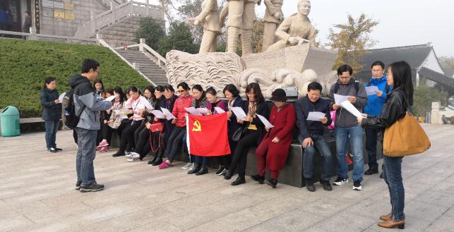 参观结束后,在纪念馆外的新四军雕像下,所有党员结合自身专业特点齐声诵读习近平总书记治国理政英文版中关于中国梦的相关章节,以实际行动在革命烈士面前宣誓,忠于并献身党和人民的高等教育事业。