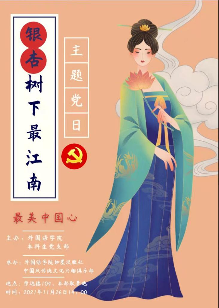 文化是民族生存和发展的重要力量。习近平总书记强调:“没有中华文化繁荣兴盛,就没有中华民族伟大复兴。”传承弘扬中华优秀传统文化,是推进社会主义文化强国建设、提高国家文化软实力的重要内容。自党史学习教育开展以来,本科生党支部深入开展“我为群众办实事”实践活动,陆续推出“我为群众办实事”——职业生涯老生经验分享系列学术讲座、“我为群众办实事”——与爱同行·暖冬有我主题活动与志愿服务举措,推动党史学习教育进一步见效。当前,正值全国青年学习贯彻十九届六中全会精神、习近平总书记“七一”重要讲话精神之际,为进一步增强青年党员对中华文化的认同感、归属感,坚定文化自信,本月,小说网 本科生党支部在严格遵守疫情防控要求的前提下,联合小说网 如墨汉服社、中国风传统文化兴趣俱乐部,于11月26日14:00在天赐庄校区举办了“银杏树下最江南”开放式主题党日活动。本次活动由小说网 本科生第一党支部书记陈晓宇主持。