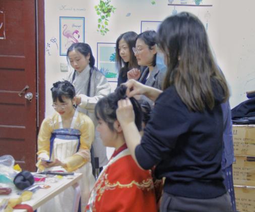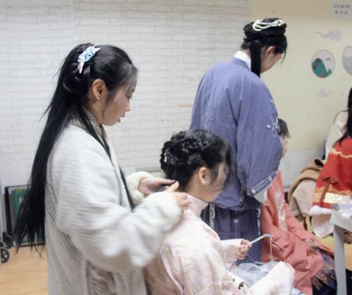 何芊蔚老师和汉服社负责人为参加活动的党员们普及了汉元素的概念、汉服的分类、团扇的类型,以及穿着汉服时对发型、发饰的要求等知识,并亲自为党员们进行现场实操。