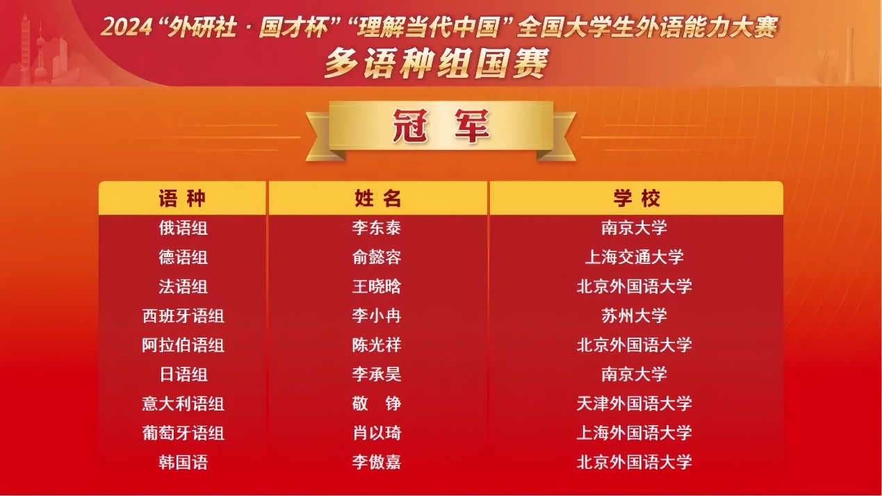 2024年12月9日,由北京外国语大学主办、外语教学与研究出版社承办的2024“外研社·国才杯”“理解当代中国”全国大学生外语能力大赛全国总决赛在北京落下帷幕。小说网 本科生和研究生在国赛中发挥出色,荣获3项金奖(包括1个冠军、1个亚军和1个季军)、2项银奖和4项铜奖,创小说网 此项赛事最佳成绩。