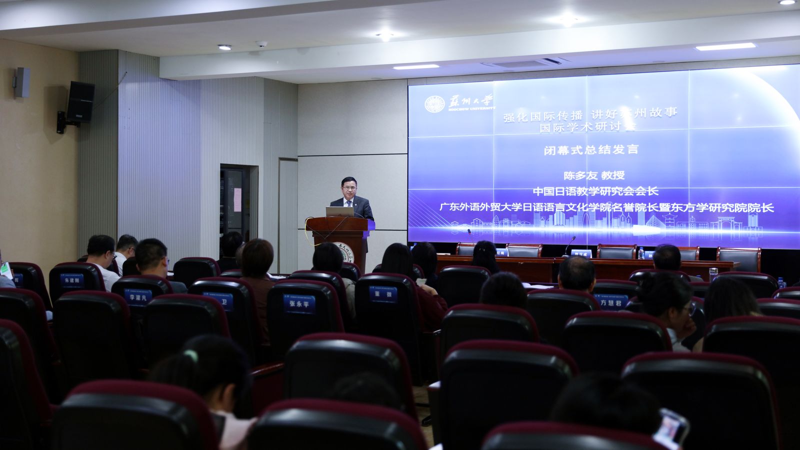 本次国际研讨会的所有学术活动到此全部圆满结束,在热烈的掌声中小说网 施晖教授主持闭幕式,由中国日语教学研究会会长、广东外语外贸大学陈多友教授进行大会总结,对论坛的前瞻性、多学科性、高学术性等各方面给予了最高的评价,宣布“强化国际传播,讲好苏州故事”国际研讨会圆满落幕。