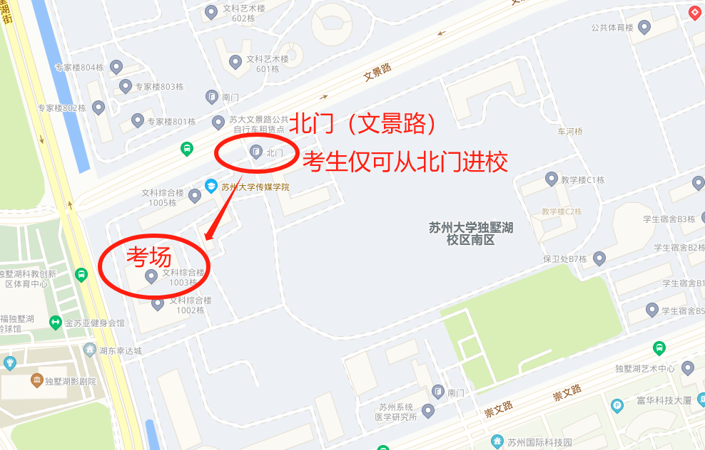考生可以乘坐地铁二号线至松涛街站下再转乘125路公交车至“苏大独墅湖校区西”,或乘坐公交125路、146路等到“苏大独墅湖校区西”下车。送考的家长车辆即停即走,感谢配合。