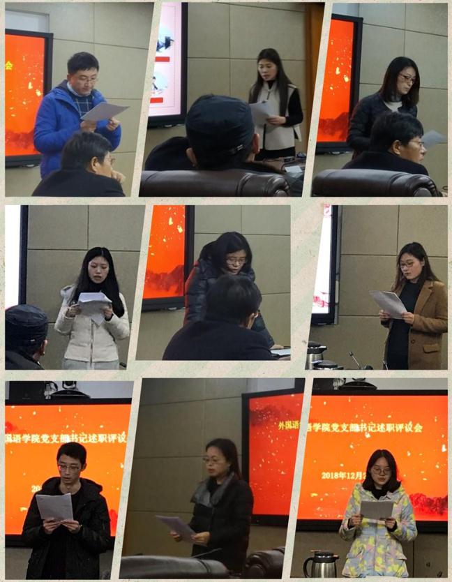 会上,教工英文支部、小语种支部、大外一支部、大外二支部、本科生第一支部、第二支部、研究生16级一支部、17级一支部、17级二支部、18级一支部、18级二支部、教工行政支部依此述职,述职结束后,由学院党委委员,党政领导班子组成的考评小组,对各支部台账进行检查,同时对照《中国共产党支部工作条例》、党支部书记述职情况进行考核评议测评。