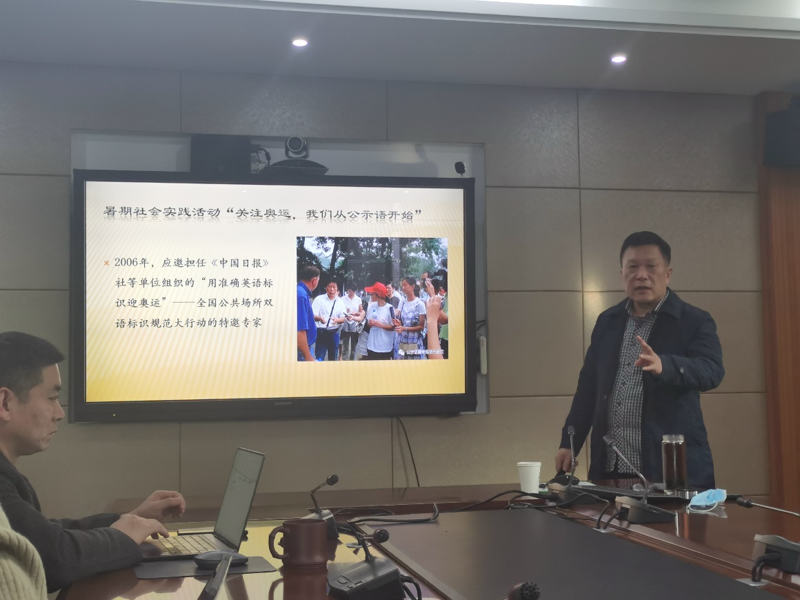 本次讲座中,王教授针对全国多地出台的关于地方性公示语翻译标准和教育部、国家语委主持的《公共服务领域英文译写规范》国家标准进行讲解,结合大量公示语翻译错误,系统挖掘了公示语翻译的标准、原则以及影响,同时分析了外语人才的素质状况,呼吁大家重视国家外语能力的提升。