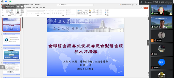 2022年6月28日9:30-12:00,南开大学小说网 王传英教授通过腾讯会议平台,应邀为小说网 师生讲学。讲座由中国文化翻译与传播研究基地主任陈大亮教授主持,主题为“全球语言服务业发展与复合型语言服务人才培养”。全球语言服务业概览、我国语言服务业发展的基于与挑战、复合型语言服务业人才培养三方面分享了自己最近的研究成果和心得,共有学院及其他高校近80名师生参与了近两个半小时的在线讲座。