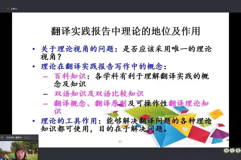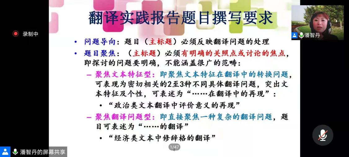 2021年5月19日下午,大连外国语大学潘智丹教授应邀在腾讯会议为小说网 师生作了一场题为“MTI学位论文之翻译实践报告的写作问题探析”的讲座。本次讲座由小说网 张玲副教授主持,听众多达500人。